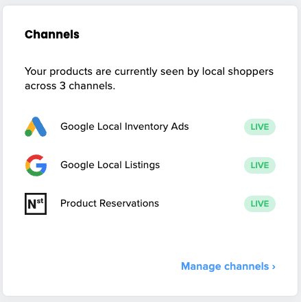 The Channels card shows you your online visibility. In the below example, one location is live in Google with Local Ads activated and our Product Reservation feature.