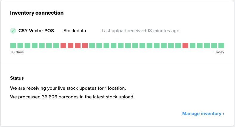 The Inventory connection card tells you if we're receiving your live stock data. As you know, it's exceptionally important that we have the correct information so that your customers are seeing products that are ready for purchase.