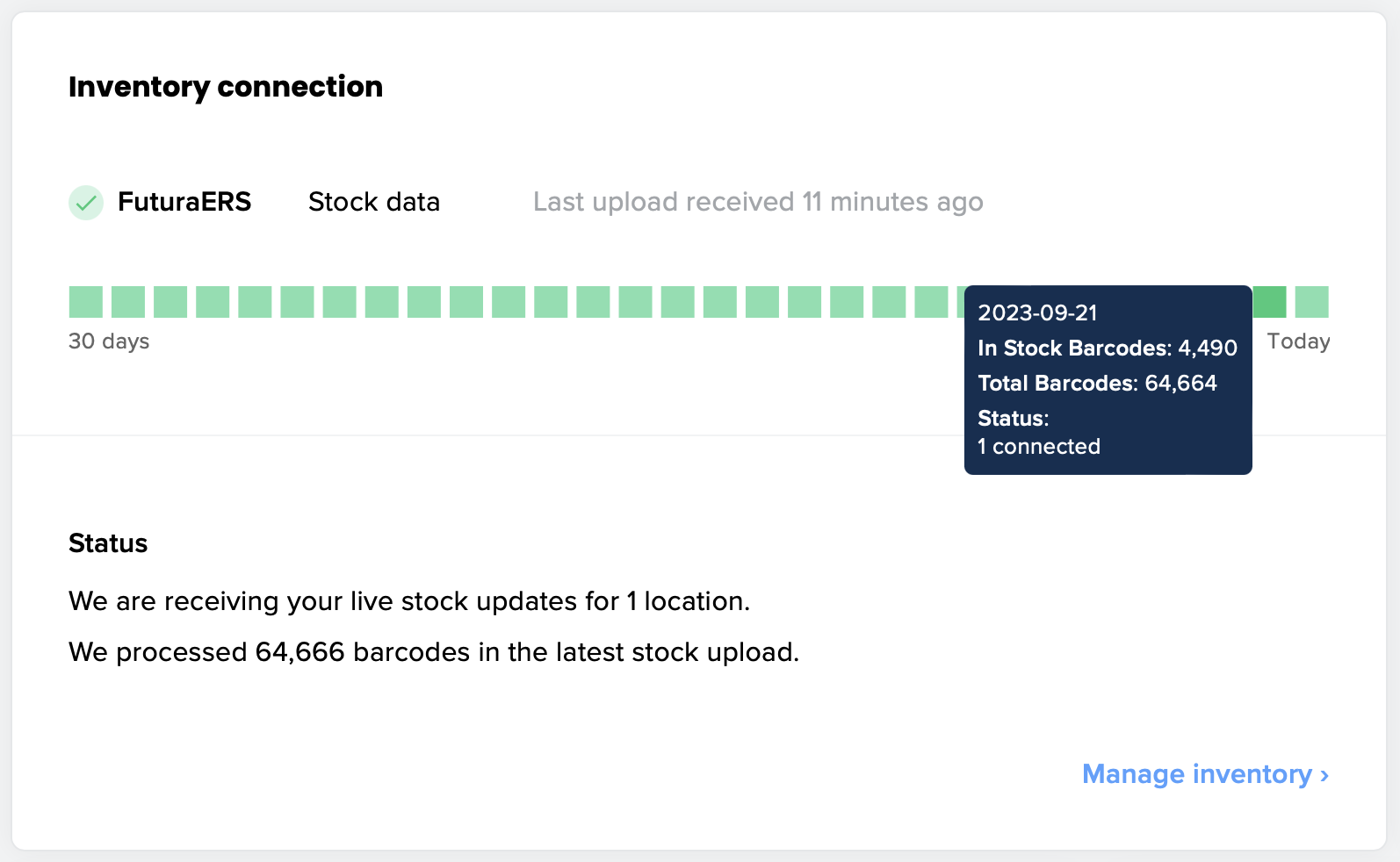 If your inventory connection graph is showing all green, then we are receiving regular updates from your point of sale! You can check the latest data we received on the Inventory page and search or edit specific items.