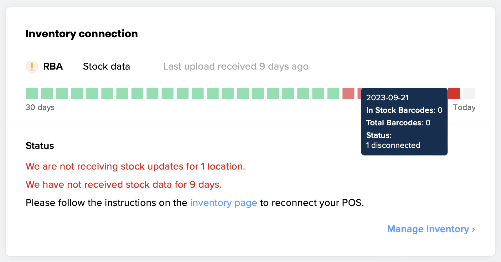 The connection graph will show an error state when your point-of-sale or product data source is fully disconnected. You can clearly see when we've stopped receiving data.