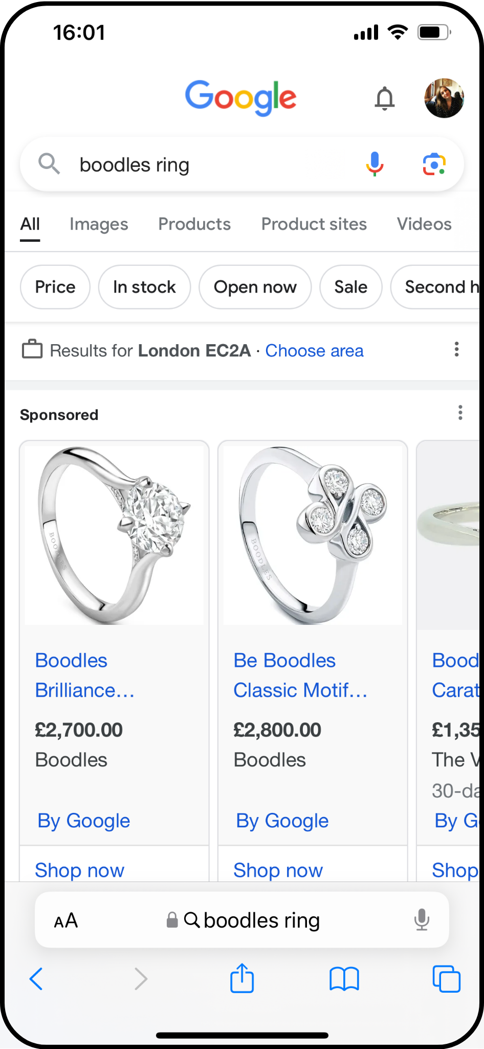 Unlike Shopping Ads, Local Inventory Ads (LIAs) promote in-store inventory and increase footfall to your shop. When a user searches for a product nearby to your shop, Google shows an image, description and title of your product at the top of the search results, however, the image also contains the distance between the searcher and your shop.