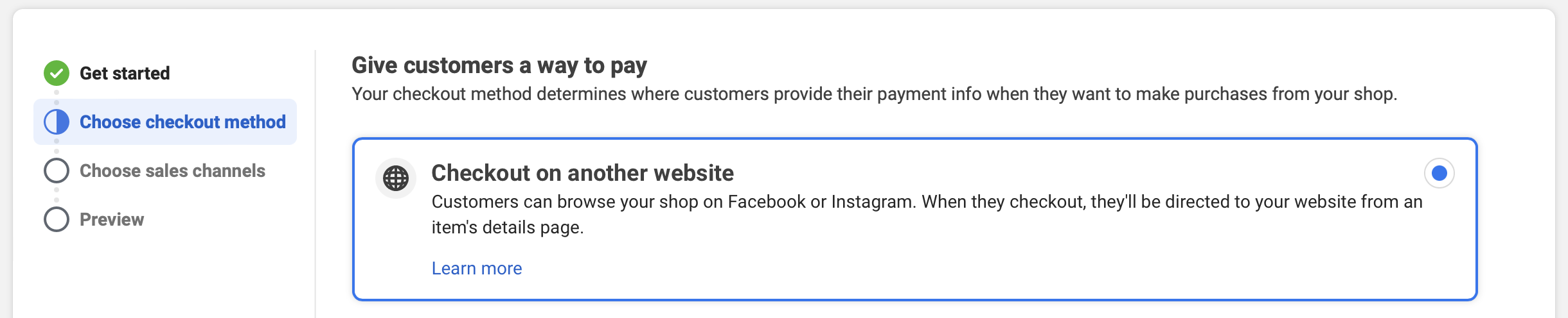 When you are setting up your Meta Commerce integration, you will create a new shop using the NearSt product catalog. This will allow you to enable any sales channels linked to your Meta business account - for example, a Facebook page and an Instagram page.