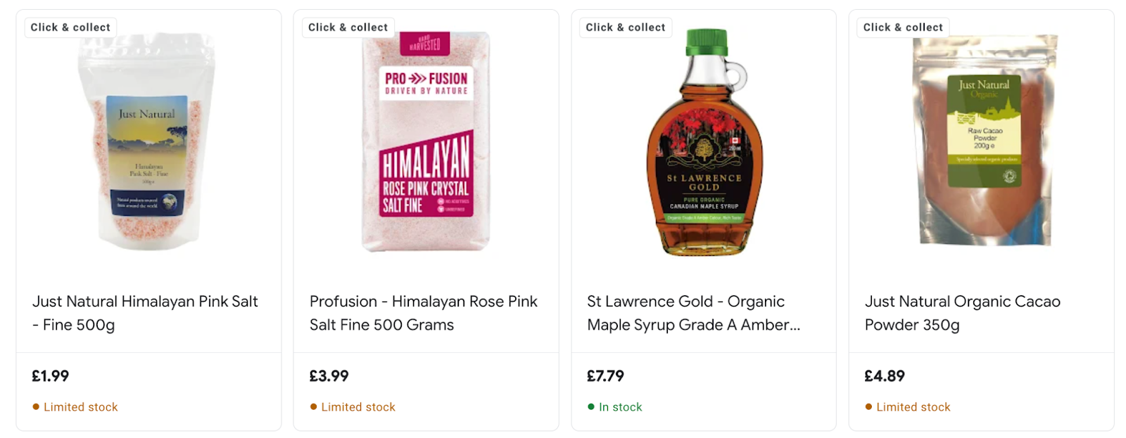 Below is an example of what the Click & Collect tag looks like for Google product listings: