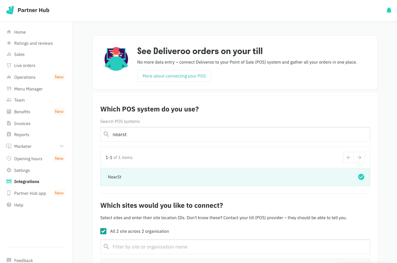 In the Deliveroo Partner Hub, go to ‘Integrations’, and search for ‘NearSt’